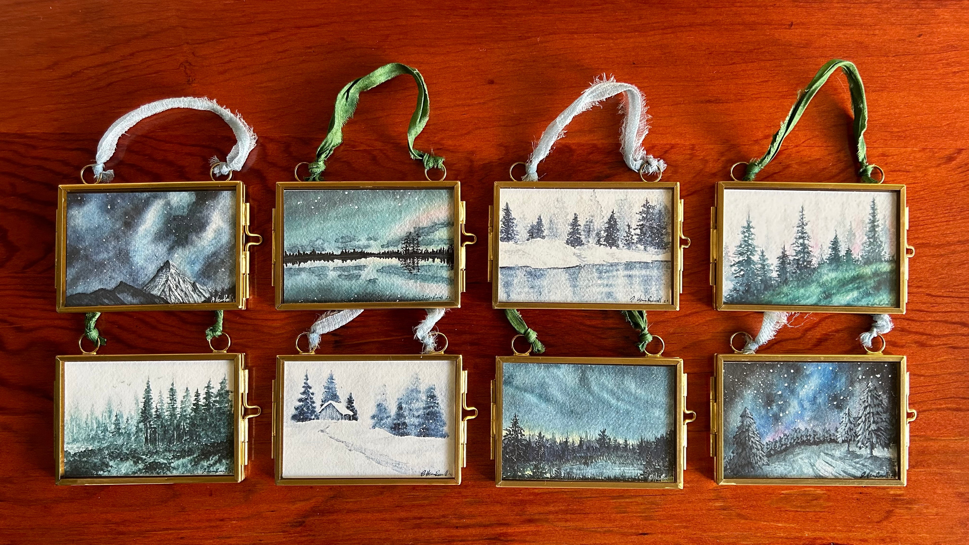 Admittedly, my hometown in California only sees the milder side of winter. So I long for those snowy misty cool winters. Perhaps that's why I enjoy painting them so much! Now you can adorn your holiday tree + home all year round with these tiny framed winter themed prints.